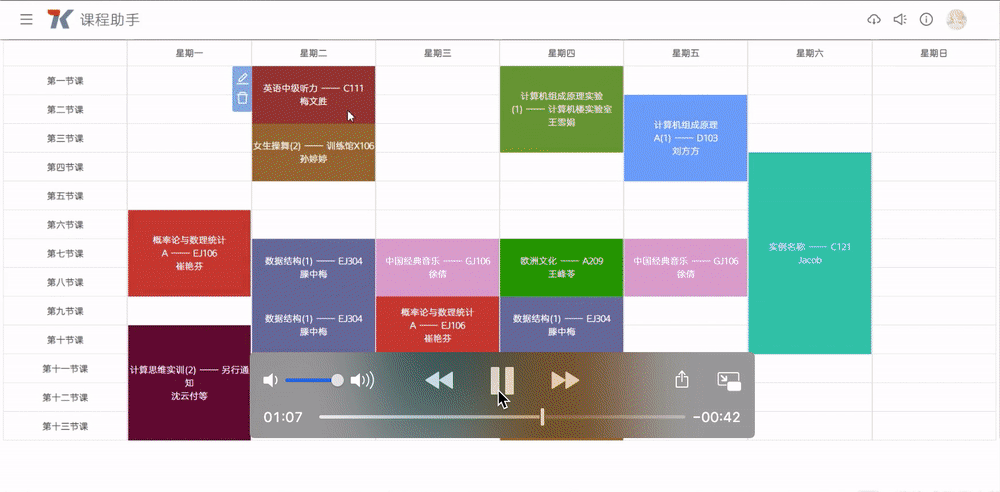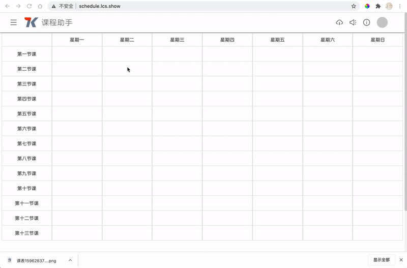 课程表就是可以通过自动导入或者手动新建的方式进行添加,但是由于浏览器跨域限制,Web 端并没有做自动导入功能,而是将其放到了 Android 端,GitHub 地址如上所示。自动导入故名思义,输入你的学号和密码,就可以通过学校教务处拉取你的课程信息,当然这个需要适配,目前只适配了上海大学(对,我就是上海大学的 😝)。 手动新增课程的方式也比较人性化,通过在课程表中下拉就可以弹出课程详情的 form 表单,输入相关的信息即可。下面通过 gif 图片来演示一下。