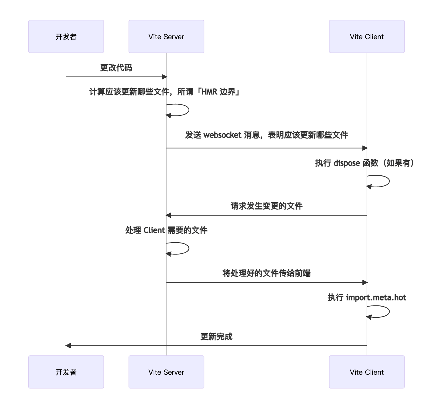 根据 Vite 源码整理出了一个大致流程,总体就是 Vite Server 监听到文件变化,通过 WebSocket 向 Vite Client 发送通知,Client 根据通知内容解析,发起 HTTP 请求获取更新后的文件,最后局部更新页面。