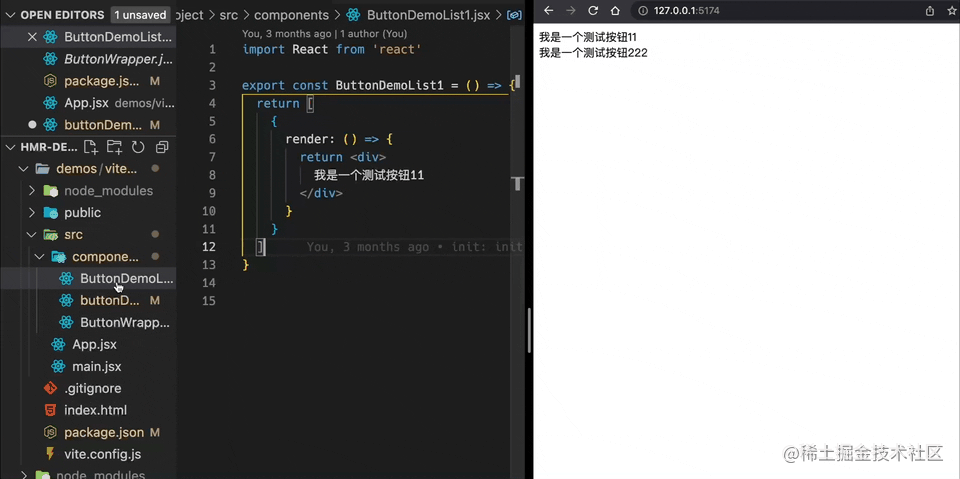 上述三部分代码分别表示三个文件,我们希望改动 ButtonDemoList1.jsx 或者 buttonDemoList2.jsx 后项目能够正常热更新,但事实并非如此… 🤪