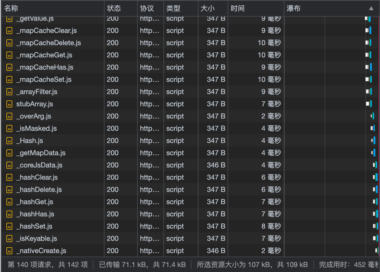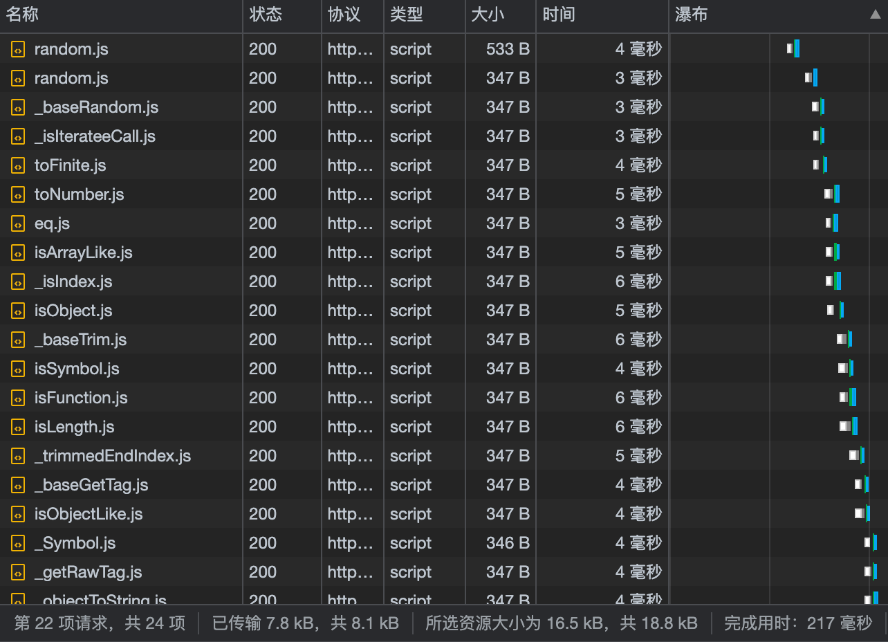可以看到,虽然我们只加载了一个函数,但是却加载了 24 个 js 文件,如果我们多引入几个函数呢?